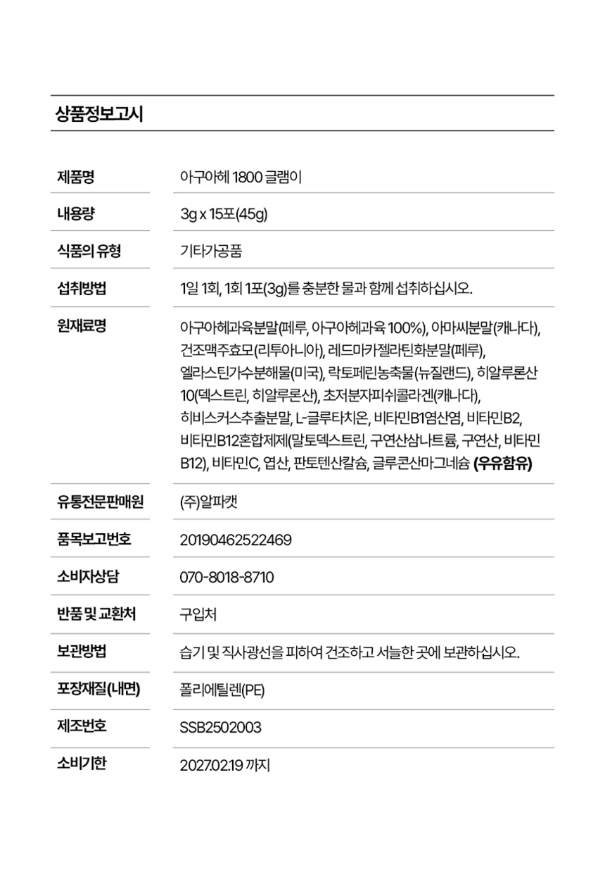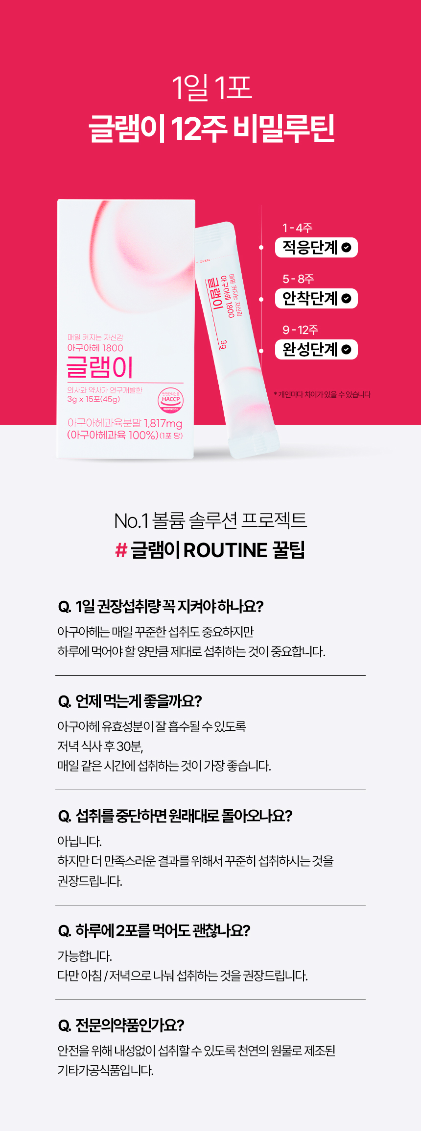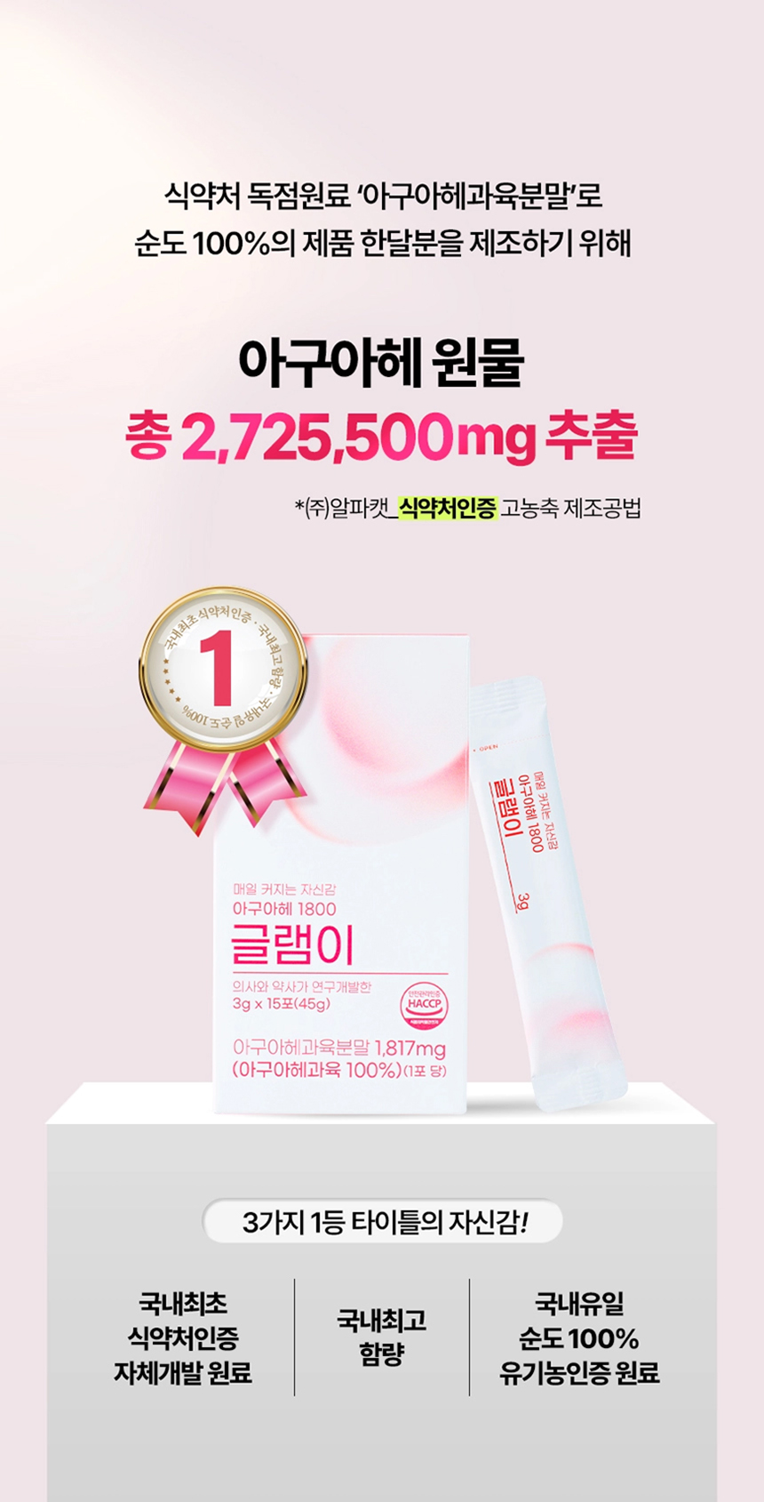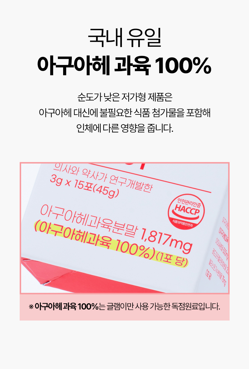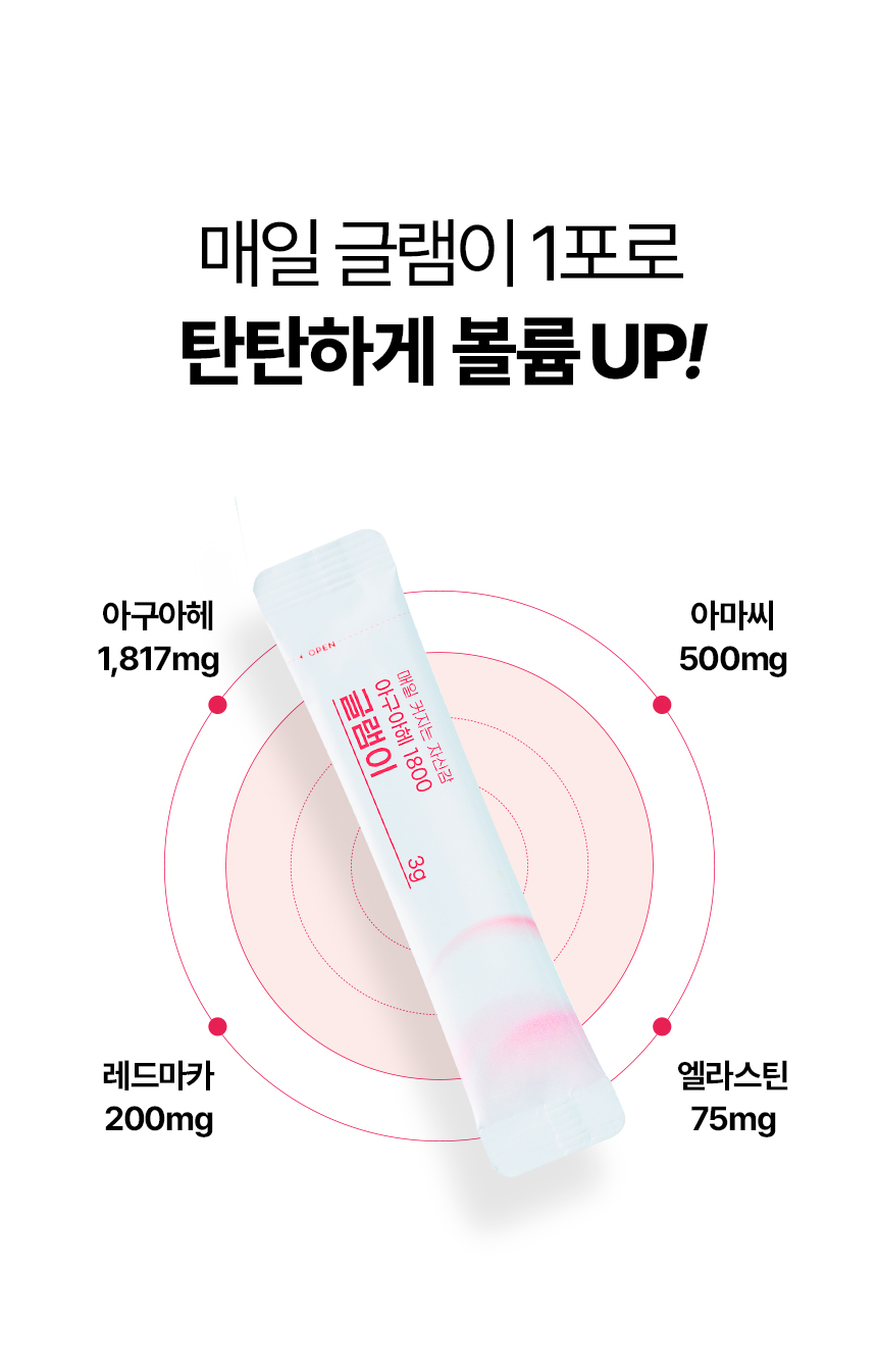 ✅ 아구아헤 국내최고함량 1,817mg✅ 국내유일 순도 100%✅ 약사 연구개발✅ 국내최초 인체적용시험 완료된 볼륨솔루션